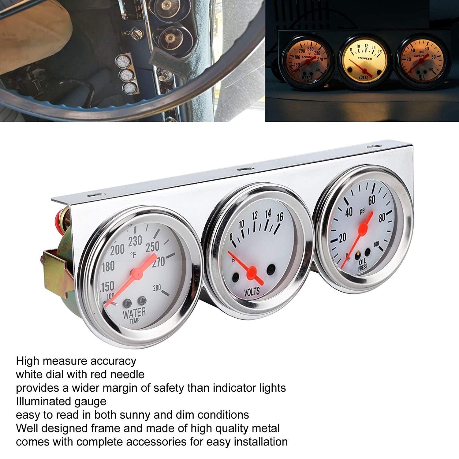 Easy Installation: Comes with complete accessories. easy to install. The illuminated gauge is easy to read in both sunny and dim conditions. easy to clean and maintain.