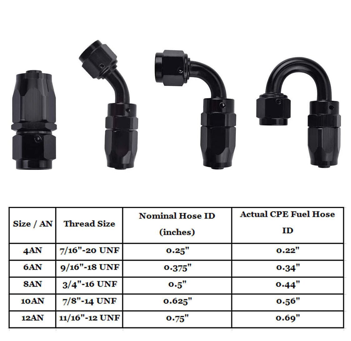 The female 4AN/6AN/8AN/10AN/12AN swivel fittings are made of lightweight aluminum alloy 6061-T6 material for strong strength and good durability. Black anodized for great appearance and anti-corrosion. superior thread strength. Max Working Pressure: 1000psi. Working Temperature Range: -65℉ to 252℉ (-53℃ to 122℃). Can be suitable for competition applications where reduced weight is needed.