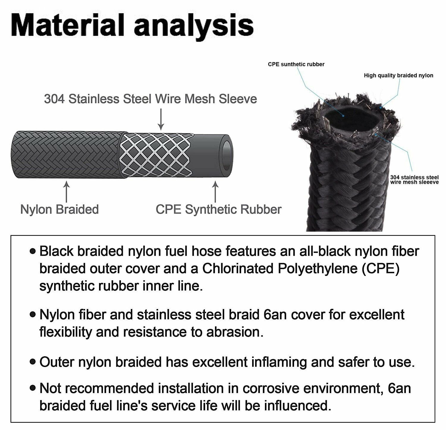 Nylon fiber and stainless steel braid cover for excellent flexibility and resistance to abrasion. Not recommended installation in corrosive environment. braided fuel line’s service life will be influenced. Outer nylon braided has excellent inflaming and safer to use. Professional installation is highly recommended.
